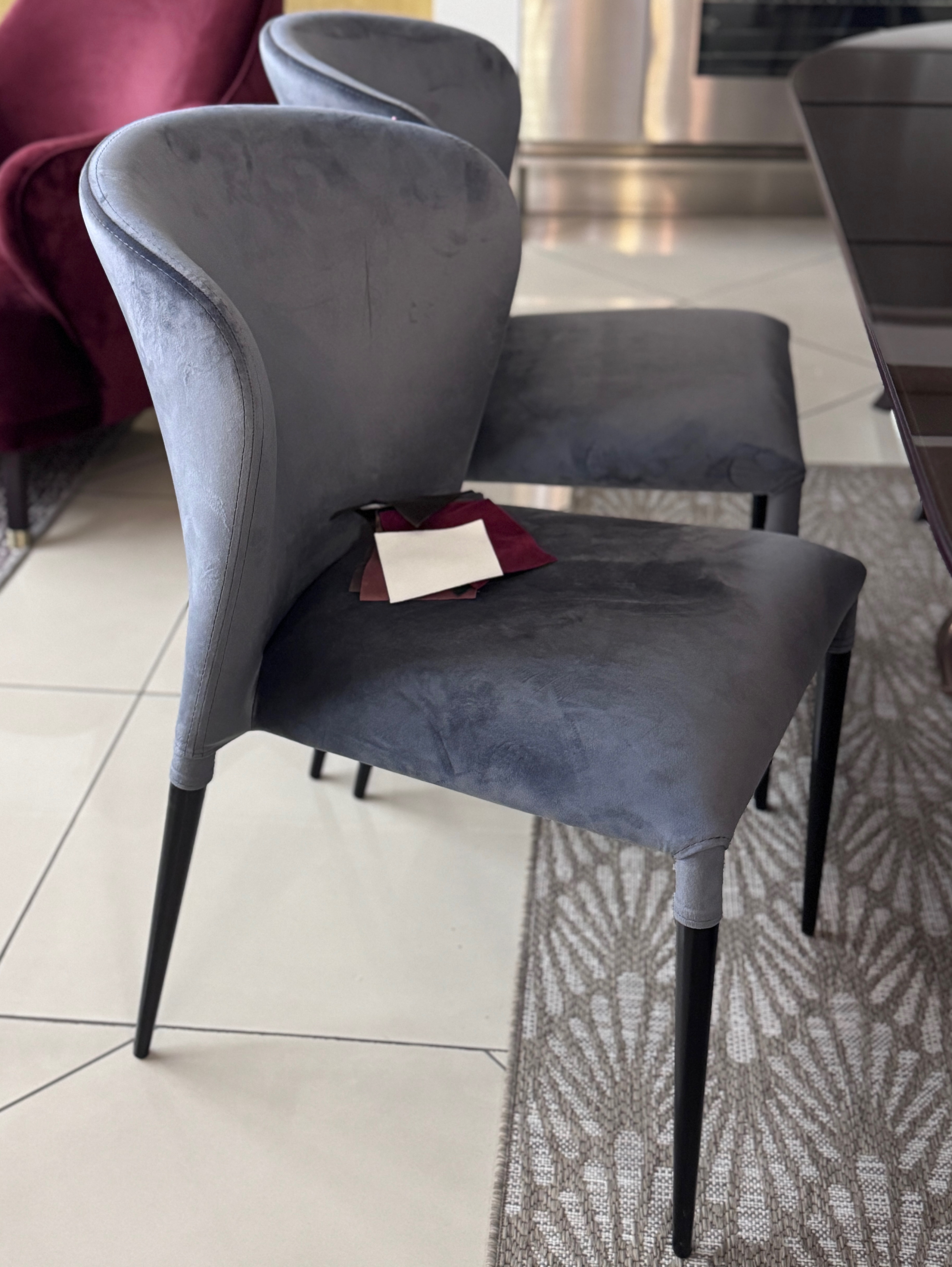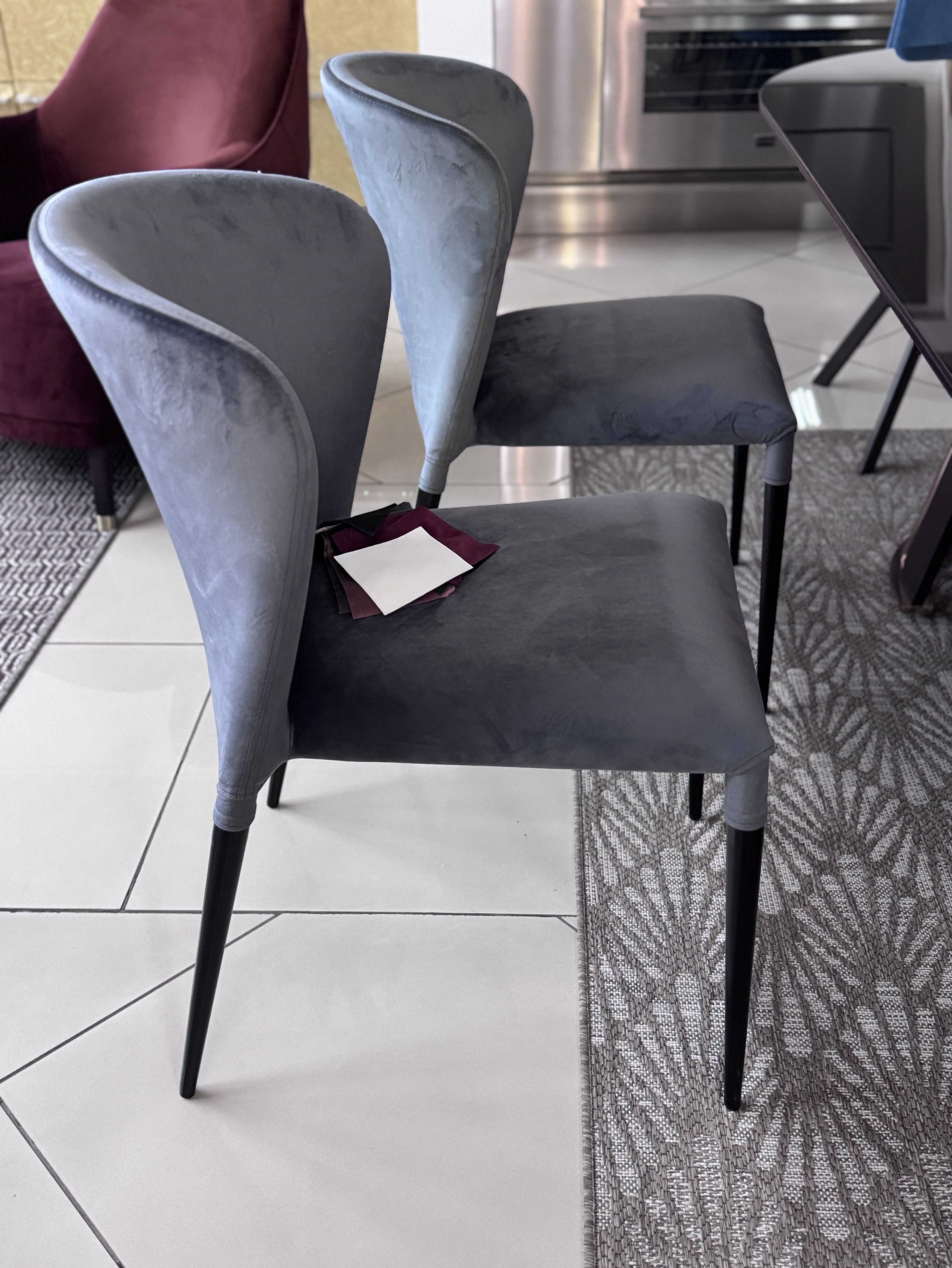 В наличии в нашем шоу руме 2 стула - текстиль: велюр серого цвета цвет необыкновенный, ножки: металл черного цвета